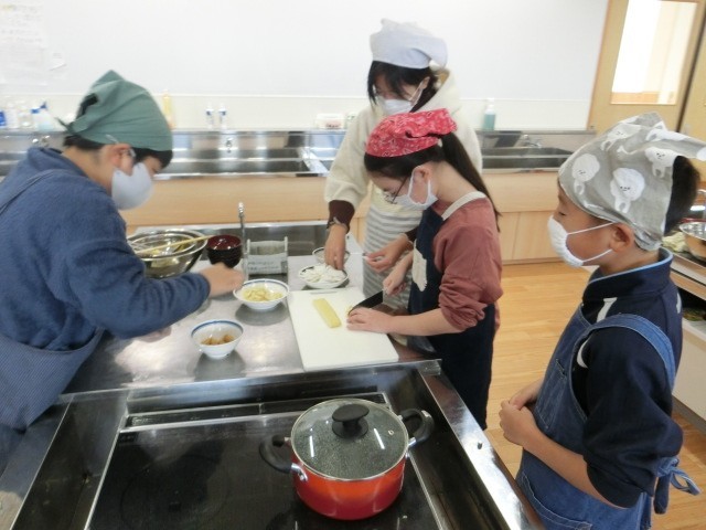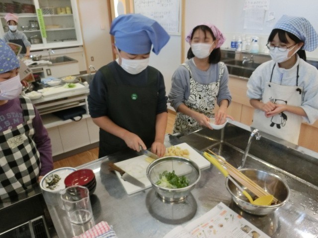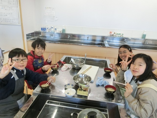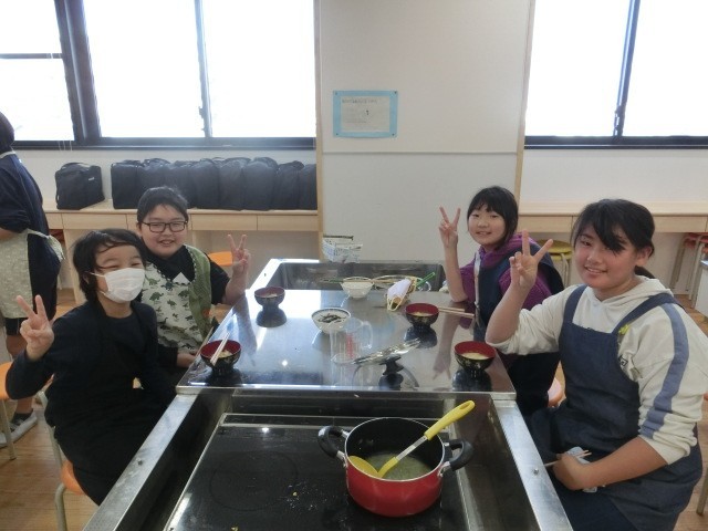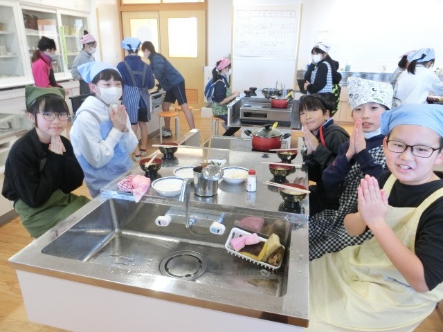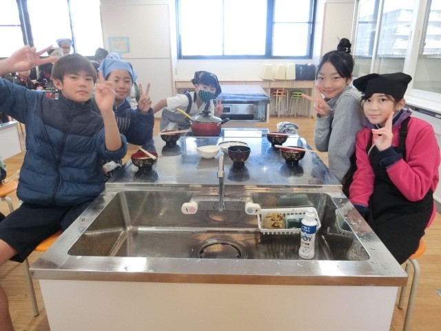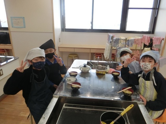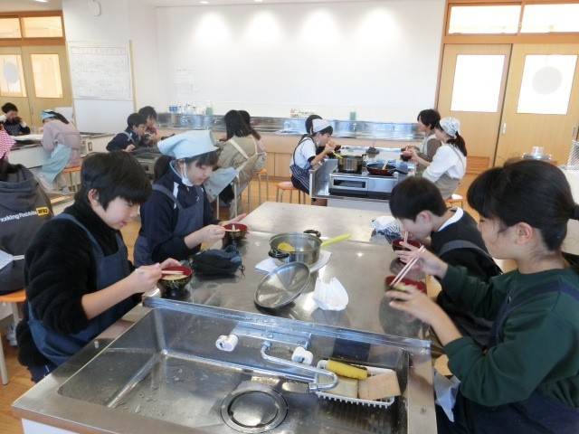 家庭科の調理実習では、みそ汁づくりに挑戦しました。具材を火に通す順番や、みそのとき方など新たな発見も多かったようです。寒い季節になりましたが、おいしそうにみそ汁を味わっていました。