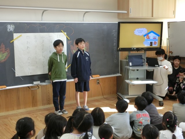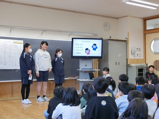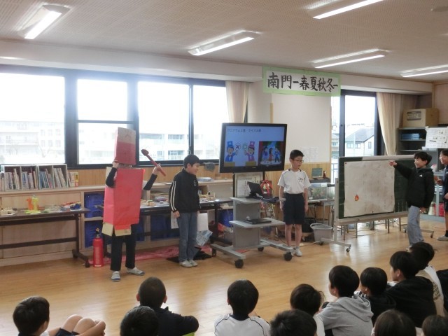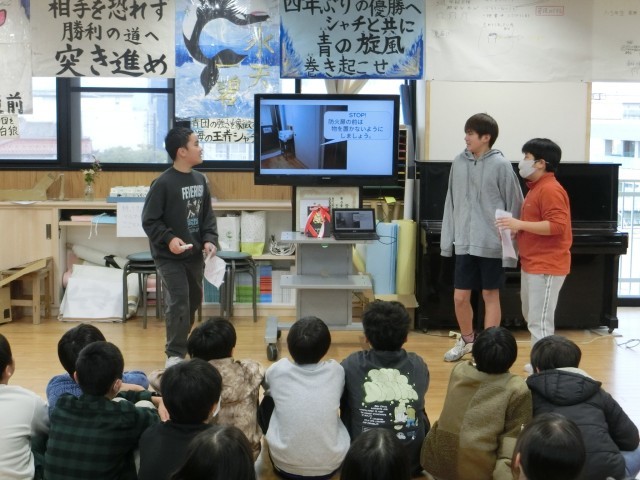5年生は、総合的な学習の時間「堀川火の用心プロジェクト」で計画していた火災予防集会を行いました。防火意識を高めようと、学年によって伝える内容を変えるなど、自分たちの手で集会をつくりあげました。