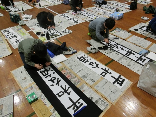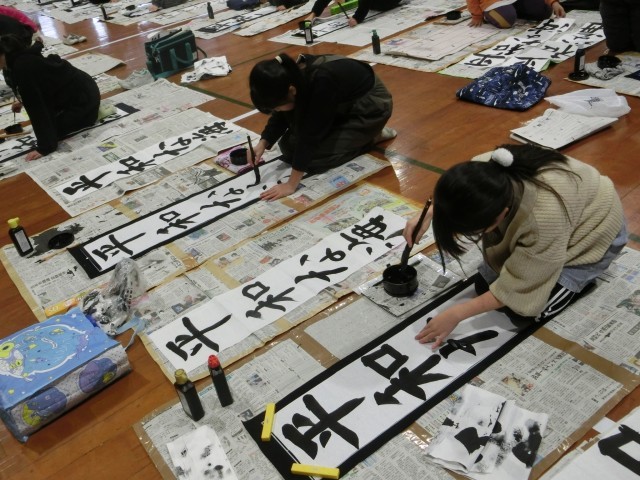 3学期が始まり、体育館で書初大会が行われました。今年の5年生は「平和な海」を書きました。冬休みの練習の成果を出そうと、心をこめて筆を動かしていました。