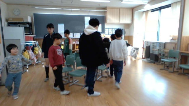 来年度入学される新しい仲間と一緒に、「なかよし交流~ようこそ なかよし級へ~」をしました。動く遊び「椅子の減らない椅子とりゲーム」と、描く遊び「何でもお絵描き」をしました。