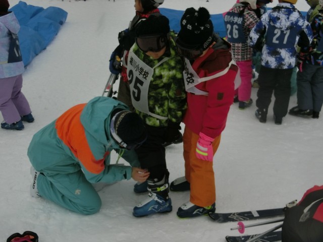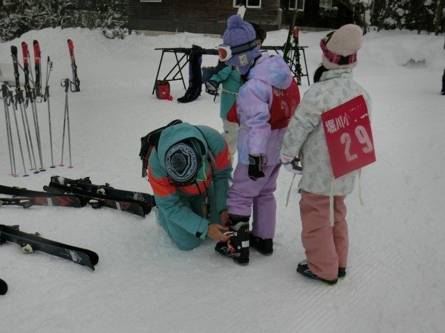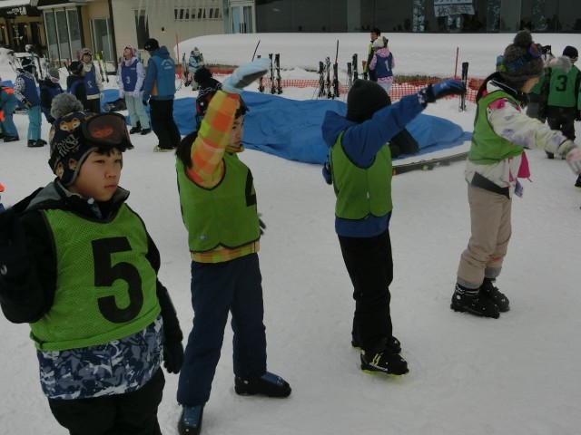 開講式のあとは、班に分かれて講習が始まりました。スキー靴のはき方を確認したり、準備運動を行ったりして講習に備えました。