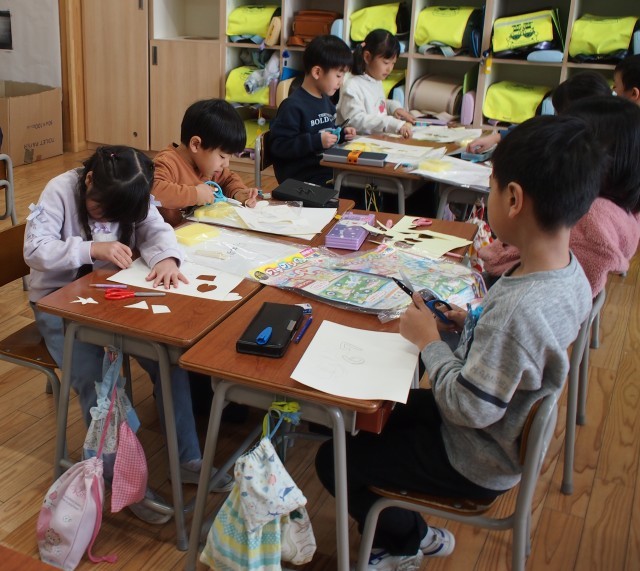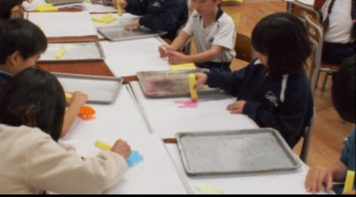 「何色の絵の具をつくろうかな」「型を取ると、形が浮かび上がるのが楽しいよ」と、色とりどりの作品づくりを楽しむ子どもたちです。