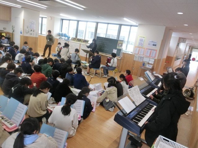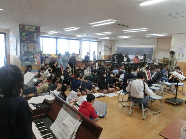 5年生は卒業式で入退場の合奏を行います。全体練習が始まり、これまでパートごとに練習してきた子どもたちも全体での音を確かめながら、より真剣な表情で合奏に取り組んでいました。