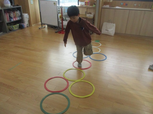 登校後、ミニフープを持ってきて、けんけんぱコースを作っていました。