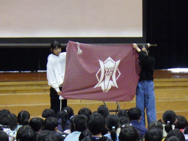 2月5日(木)に堀小ふれあいフェスティバル購入物品贈呈式を行いました。今年の堀小ふれあいフェスティバルの収益金で、掲揚塔に毎日掲げている校旗を有成会でご購入していただき、学校に寄贈していただきました。有成会会長の源さんからは、毎日元気に過ごし、同じ堀川小学校の仲間として頑張ってほしいという子どもたちへのメッセージとともに、児童代表の二人に目録を贈呈されました。校旗が新調され、堀川小学校の正門横でたなびく様子が楽しみになりました。