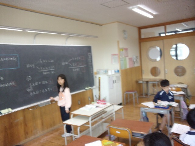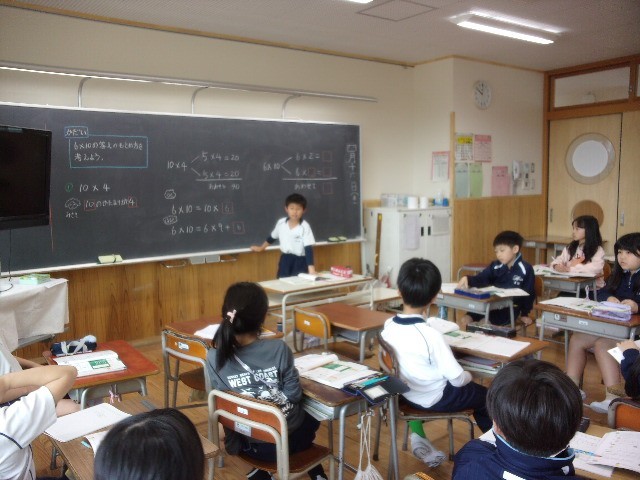10×4や6×10の答えの求め方を自分の考えを伝え仲間の考えを聞くなどみんなで考えました。かけられる数やかける数が10のかけ算でも、かけ算の決まりを使えば、答えを求めることができることに気づくとができました。