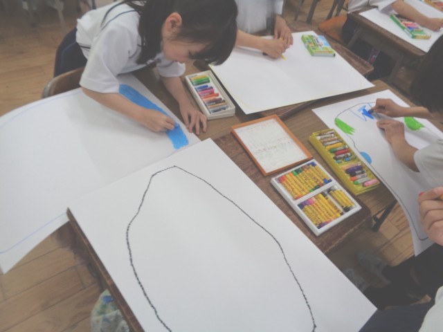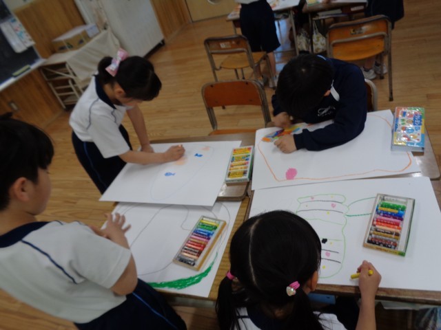 図画工作科「ふしぎなたまご」の製作中です。画用紙いっぱいにそれぞれの「ふしぎなたまご」を描きました。「割れたら大変だよ!」「何が生まれるのかな」とワクワクしていた子どもたちです。