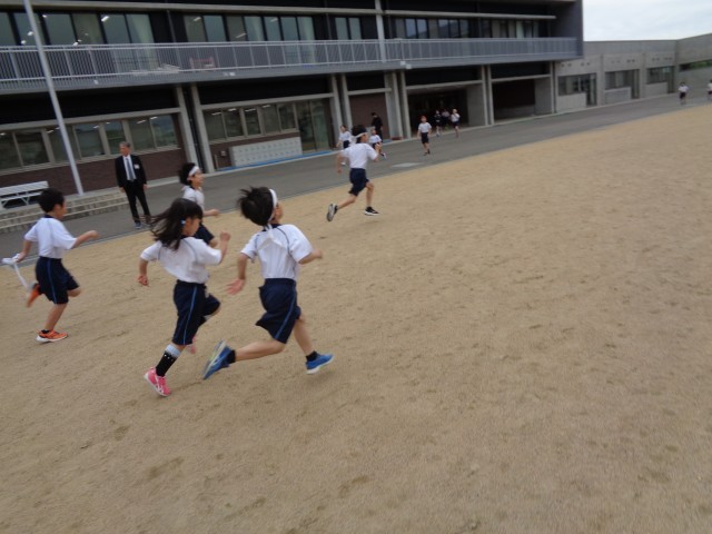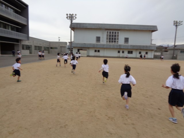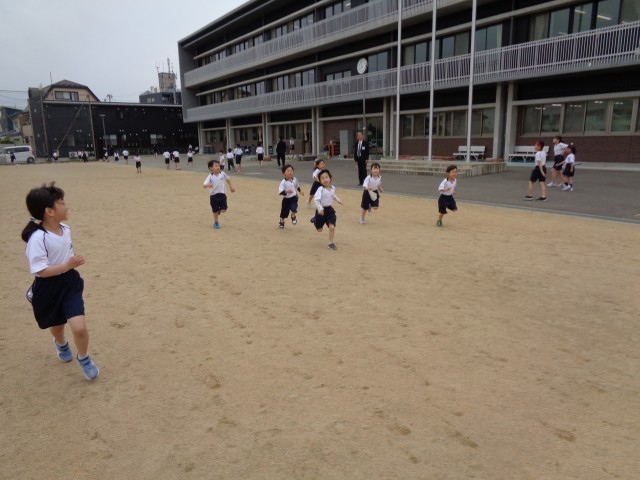 2~5年生が1年生と一緒に走ってくれています。「2年生は速いなぁ」「5年生に勝てた!」先輩たちの背中を追いかけ、目当てができ始めた1年生です。