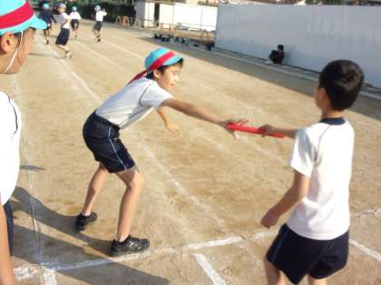 リレーでは、仲間にバトンを渡すタイミングが合うように、練習をしています。バトンパスがうまくいくと、「今のは、よかったよ」「いい感じになってきたね」と、ファミリーの仲間が声をかけてくれます。学年リレー大会に向けて、頑張ります。