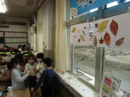 あきをたのしもう(1年生) 公開日 2020/11/20 更新日 2020/11/20 1年生 生活科「あきをたのしもう」の学習で、集めた秋の物を使ったり、つまようじや紙コップ等の材料を使ったりしながら、いろいろなものを作って遊びました。どんぐりのこまを作ってきれいに回る様子を楽しむ子どもや、色とりどりの葉っぱを画用紙に着けて飾りにしたり、袋につけて服のようにして着たりする子どもの姿がありました。また、秋の物の匂いや手触り、音など、五感を通して秋を楽しんでいる様子も見られました。
