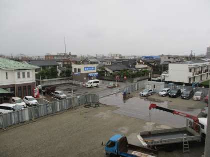 上の写真は、敷地北東側(旧おもしろ花壇付近)からの様子です。敷地西側では2台の大型クレーンがフル稼働でくい打ち作業が行われています。下の写真は、敷地北東側の様子です。重機や生コンクリート、土砂の搬出入に使われています。