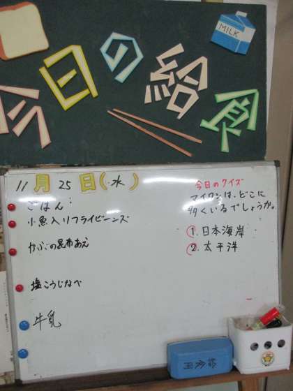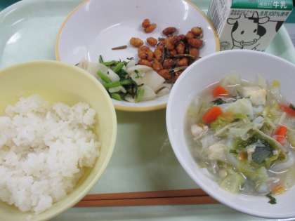 今日の献立に「塩こじうじなべ」がありました。「塩こうじ」は、こうじに塩と水を加えて、10日ほど常温で発酵をさせたものです。お米の甘みと塩の辛みが合わさり、いろんな料理につかえる調味料です。今日はこの「塩こうじ」を調味料として使った汁物でした。昨日の「豚汁」とは、また違ったおいしさがありましたね。