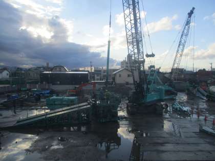 工事現場では、引き続き杭工事が行われています。この第1期工事では、15mの杭が全部で88本地面に打ち込みが予定されています。珍しい工法で行われているそうです。現在の工事の詳細については後日、お知らせします。お楽しみに!