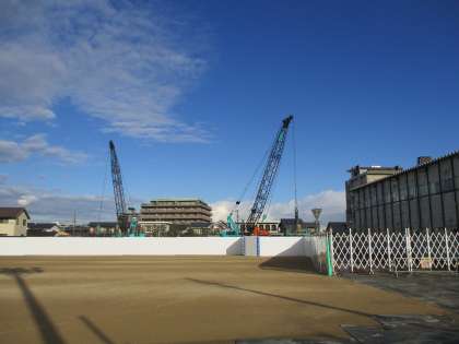旧校舎の取り壊し工事が終わり、新校舎の改築工事が本格的に始まりました。大きなクレーン車が2台搬入された工事現場からは、大きな音が聞こえます。また、大きなミキサー車が何台も出入りしています。どんな工事が行われているのでしょうね。