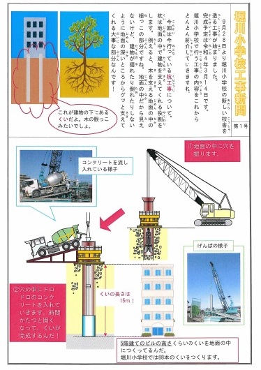 今回、富山市役所、工事関係者のみなさんのご厚意で、「堀川小学校工事新聞」を発行することになりました。第1号は、現在行われてる「杭工事」についてです。