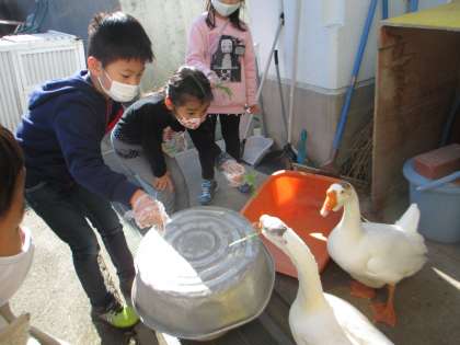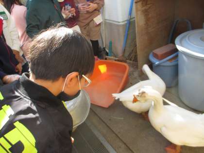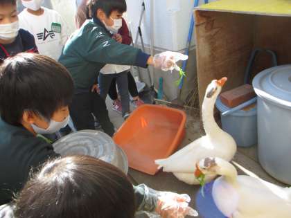 生活科「ガガ、ピピとなかよし」の学習を行っています。今日は、前回の反省から、ガガ、ピピとどう触れ合うか、考えを聞き合ってからガガ、ピピに会いに行きました。いろいろな意見のなかで「えさをもらえれば喜ぶんじゃないかな」といった意見があり、えさやりに挑戦する子どももいました。また、「えさは朝夕にあげているから今あげるのはどうなのか」といった意見もありました。子どもたちそれぞれが、なかよしについて考えています。