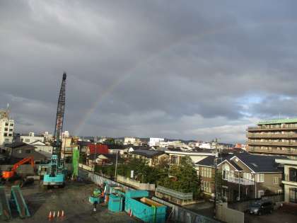 朝活動後、3年3組近くの階段踊り場から「きれい!」「よく、見えるよ!」「消えるかもしれない、はやく見て見て!」等の声が聞こえてきました。西側に虹がかかっていました。子供たちは、外の虹を眺めながら「虹の始まりが見えるよ!」「虹に願い事をしたらかなうんだって!」「してみよう!」「今日、いいことがあるかな!」等、話していました。どんな願い事をしていたのでしょうね。