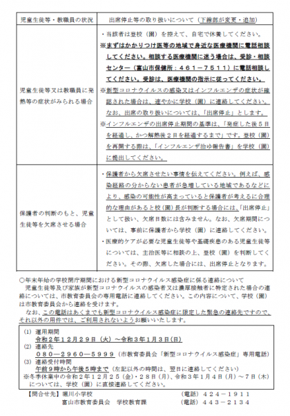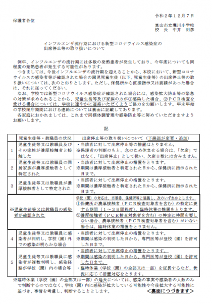 12月に入り、様々な感染症の懸念が出ていることから、新型コロナウイルス感染症の出席停止等の取り扱いについてお知らせを配付しました。こちらの指針に留意しながら、これまで同様、感染防止等に努めていただきますようお願いします。
