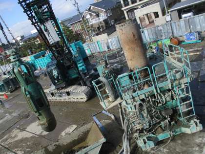 大きな機械ろクレーン車を使って、地面に穴が掘られています。この穴に、鉄筋と大量の生コンクリートが流し込まれて約15mのコンクリート杭が作られます。