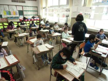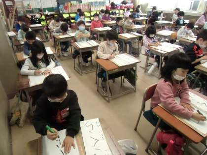 書き初めの練習スタート(1年生) 公開日 2020/12/10 更新日 2020/12/10 1年生 1年生では、書き初めの練習を始めています。硬筆墨に初めて触った子どもたちは、用紙にいろいろな線を書くことから始め、最後には1枚の清書をしました。この1枚目からどれだけ成長できるか、子どもたちはやる気まんまんといった様子でした。