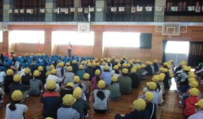 避難後、前で話をなさる先生に心をつなげている子どもたちの様子です。