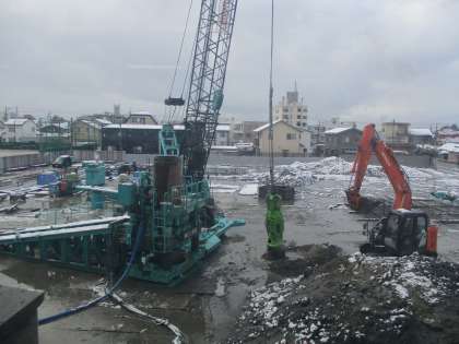 堀川小学校 「いま」・むかし 12/15 杭打設工事 公開日 2020/12/15 更新日 2020/12/15 堀川小学校 いま・むかし 基礎杭の打設工事が進んでいます。今回の第1期工事では、全部で88本の杭が作られるそうです。