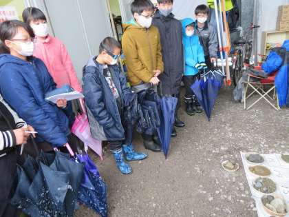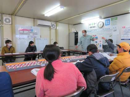 今週、6年生の代表児童10名は、学校建設工事現場を見学させていただきました。特別に、工事現場にある事務所に入らせていただき、工事がどのように行われているのか説明を受けました。現在行われている「杭を打つ作業」は、地下17mもの深さまで穴を掘り、そこに鉄筋とコンクリートを入れて建物を支える杭にするそうです。全部で80本以上も杭を打つと聞き、子どもたちは驚いていました。また、穴を掘る時に採掘した土を深さごとに分けた試料も見せていただきました。理科で学習した地層のつくりを実物で確認することができました。