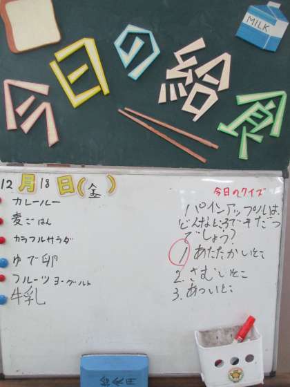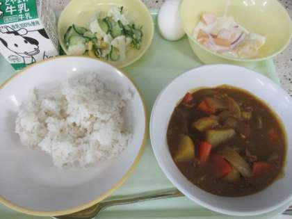 今日の「カラフルサラダ」に入っていた野菜は、カリフラワー、きゅうり、コーンでした。3色できれいな色どりですね。自然の色のパワーから元気をもらえたのではないでしょうか。