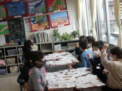 国語の学習で冬の言葉を入れたかるたを作りました。今日はかるた大会です。子どもたちがたくさんのかるたを作ったので大会はまだ続きます。