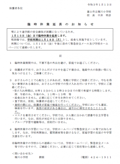雪により通学路の安全確保が困難になっているため、1月15日(金)まで臨時休業を延長します。