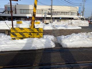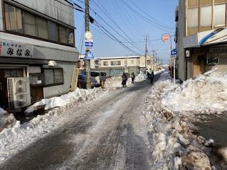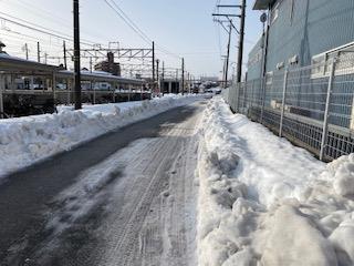 道幅が狭くなっているため、車がすぐ横を通って行きます。スリップしてくる可能性もあるので、道の端で立ち止まり、車が通り過ぎるのを待ちましょう。