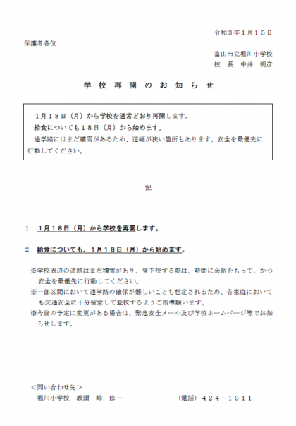 1月18日(月)から学校を通常どおり再開します。