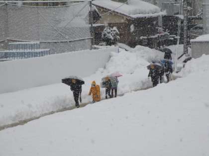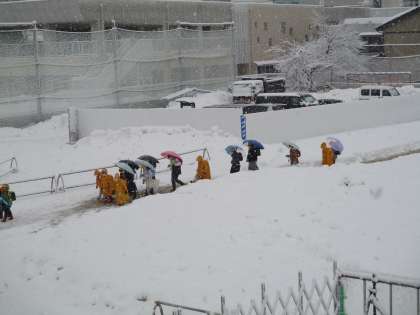 今日は、雪が降る中での登校でした。子供たちは、雪にも風にも負けず、整然と並んで登校していました。