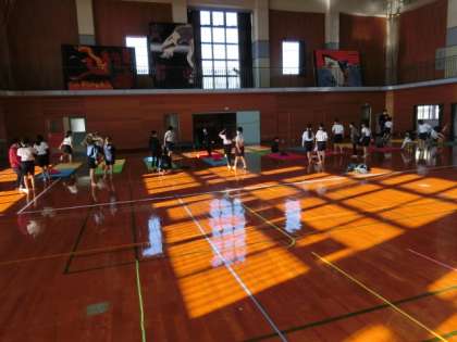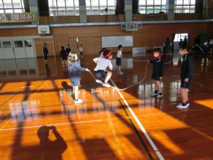 体育館で体育の学習を行いました。子どもたちは元気いっぱいです。長縄跳びやマット運動に取り組みました。