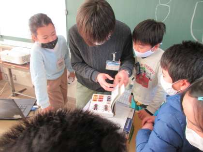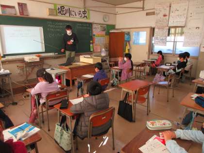 2限目に富山市科学博物館の昆虫担当の学芸員でいらっしゃる岩田朋文さんに、冬にいる昆虫についてのお話を伺いました。授業後も、質問にいく子どもたちの姿が見られました。