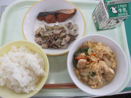 今日の卵とじには、「厚揚げ」が入っていました。「厚揚げ」は、とうふを油で揚げて作られたものです。とうふが食べられるようになったののは、室町時代からで、歴史の古い食べ物です。