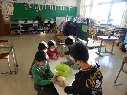 みんなで ヘチマの皮をむいて 種取りをして ヘチマタワシを作りました。