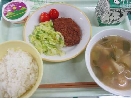 今日の給食では、絵本の登場人物が献立に取り入れられています。『とんかつ』は、ソースをかけて甘辛く仕上げられ、主人公のキャベツくんをイメージした『ゆでキャベツ』をそえられていました。また、『月夜のゼリー』は、ブルーベリーゼリーで夜空をイメージして、月夜が輝く様子が再現されています。