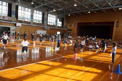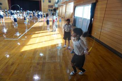 体育科の学習で、なわとびを行っています。なわとびカードを進めるために練習したり、同じ跳び方で跳べる数を増やすために練習したりするなど、その子なりの目当てをもって、なわとび運動に取り組む子どもたちです。