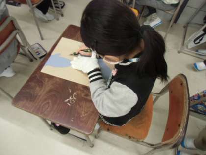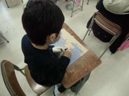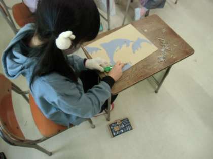 ほって すって 見つけて(4年生) 公開日 2021/02/01 更新日 2021/02/01 4年生 図画工作科では、版画の学習をしています。3年生の時に学習した彫刻刀の使い方を確認して、安全にていねいに作業を進めています。どんな作品に仕上がるか、完成が楽しみですね。