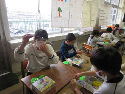 離れている鉄を磁石が引き付けるかを確かめたり、磁石の極の性質を調べたりしました。下敷きを挟んでも磁石を引き付けたり、同じ極同士が退け合ったりする様子に驚く子どもたちでした。