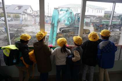 1年生のまちから見える工事現場が日々様子を変えていきます。様々な働く車や、地面の形、働く人達等、工事現場のいろいろなものに興味をもって、窓の外を覗き込む子どもたちです。
