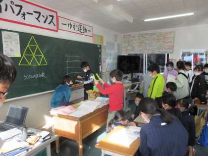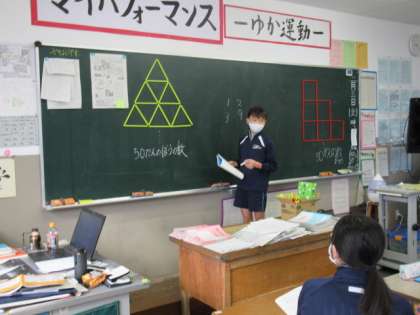 算数科では、棒の数の変化を表や式に表しながら、規則性がないかを考えています。教科書の問題を少し変え、応用問題に取り組んだ子どもたちは、考える視点や解き方に悩みながらも、自分なりの考え方を構築し始めているので、黒板を使って仲間に考えを伝えています。算数科では、解くための数のとらえ方を大切に取り組んでおり、難しい問題にも仲間と考え合う楽しさを実感しながら、最後まで粘り強く取り組んでいます。
