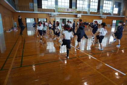 運動委員会からもらったカードをもとにいろいろな動きをする運動に取り組んでいます。寒い冬でも元気に運動する1年生です。