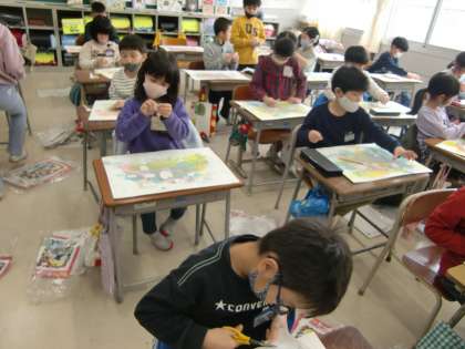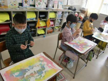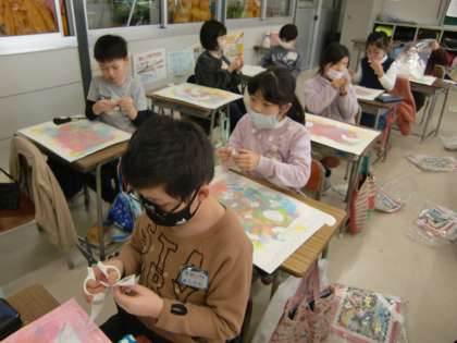 先日ローラーで色つけした画用紙に形に切ったシールを貼りました。仕上がりを楽しみにもう少し頑張ります。