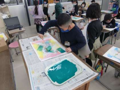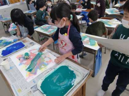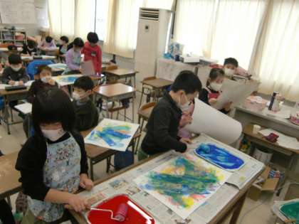 図画工作の時間 (2年生) 公開日 2021/02/09 更新日 2021/02/09 2年生 今日は、「緑色」「青色」「赤色」の順番に台紙にローラーで色をつけました。 みんな、一生懸命に取り組んでいます。どんな作品に仕上がるかが楽しみですね。