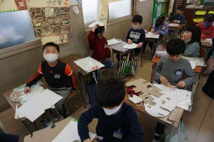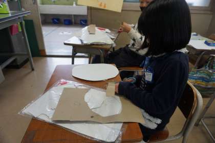 図画工作科の学習で、紙版画に取り組んでいます。版になる顔を作っている様子です。思い描く表情や、もともとの形が違うため、目や口等の材料や形は一人一人違います。自分なりの紙版画を作っていく子どもたちです。