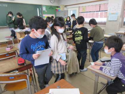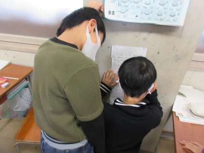 馬場級では「ぼうグラフ—わたしとクラスの仲間−」の学習に取り組んでいます。棒グラフを作るために、学級の仲間に質問をしたり、掲示物を作って書き込んでもらったり、アンケートを作ったりと工夫して自分の取組を進めている子どもたちです。データを集め終わった子どもからは、「どんなグラフができるか楽しみだな」「見やすいグラフを作りたいな」という声が聞こえてきました。