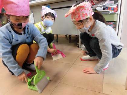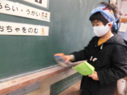 家からちりとりと小ぼうきを持ってきて、隅々のほこりを集める子どもたち、教室の黒板のチョークを集める子どもたちの姿です。黙々と取り組んでいます。