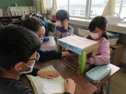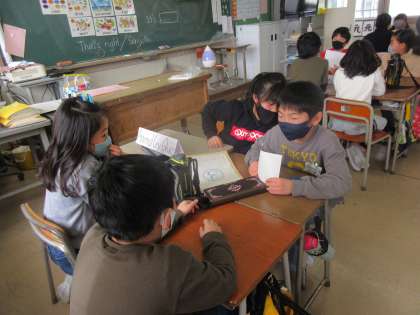 外国語活動の時間に、クイズ大会をしました。シルエットクイズや鳴き声クイズ、3ヒントクイズなど、これまでに学習したことを使って、ファミリーで出し合いました。「What's this?」の言い方にも少しずつ慣れて、上手に話をしている子どもたちでした。